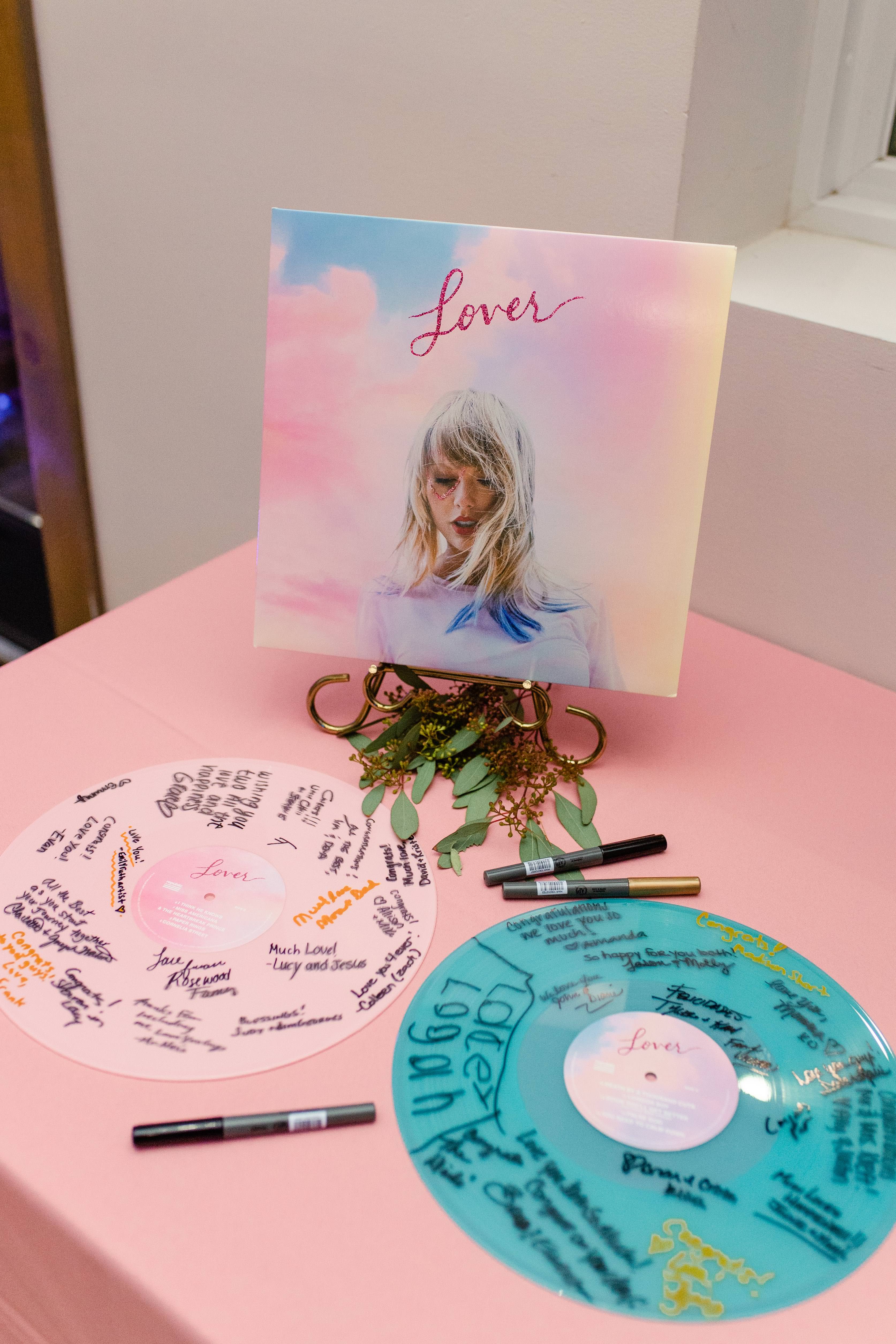 Guest Book’s are a thing of the past! Rarely do I ever see a traditional guest book at a wedding any more! This is probably one of the most searched wedding details on Pinterest, there are literally tons of fun options! I personally wanted to have our guests sign something we could display in our home & see every day. We chose to have the vinyl records of our first dance song signed by our guests! We collect records, so this was this perfect addition to our record wall in our living room. Our first dance song was Lover by Taylor Swift; look how perfectly they turned out!