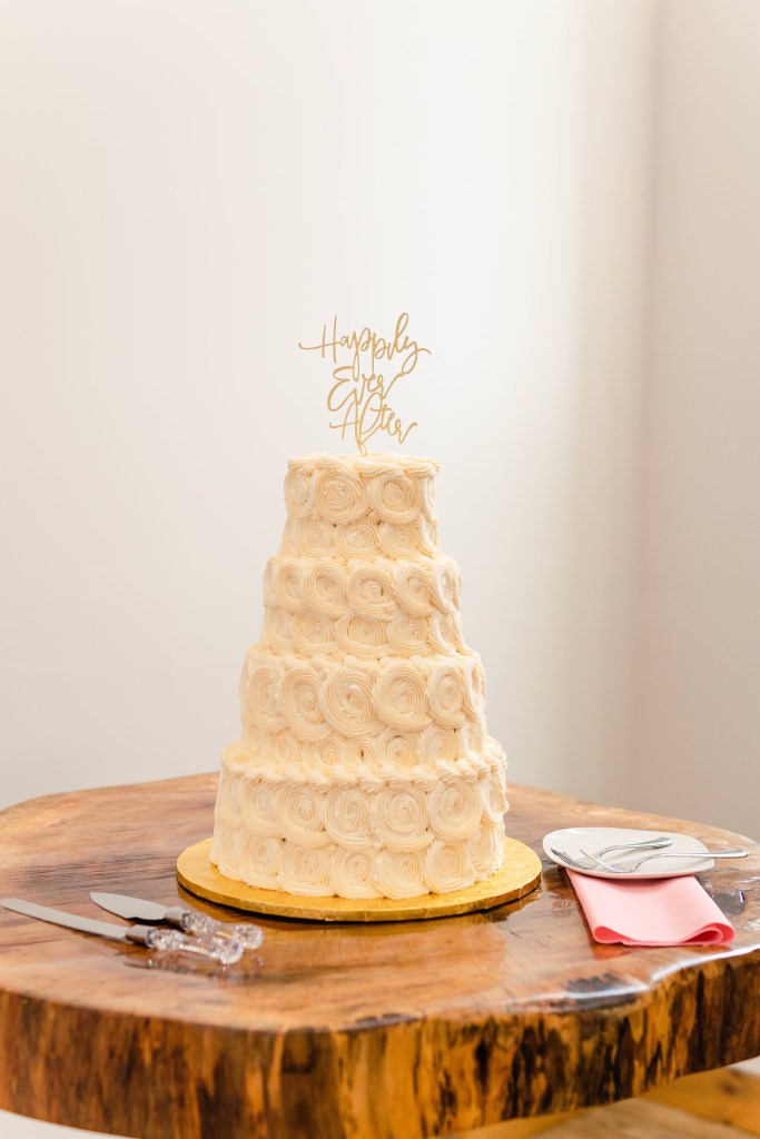 Wedding Cake remix! I knew from the jump I wanted to have a classic, traditional wedding cake. After meeting with our baker, we discussed fun ways to make our cake stand out, while still being decorated with simple, large buttercream rosettes like I wanted. Our cake was 4 tiers, with each one a different flavor! We had chocolate, vanilla, marble, and red velvet cake with different filling in each tier! The bottom layer is the one you traditionally cut, so it had to be special: I had the baker dye our vanilla flavored cake tier PINK to match our wedding color! It was such a fun little surprise for everyone when we cut into it! (Pro Tip: Be sure to make the top tier your favorite kind of cake; that’s the one you’ll take home!)